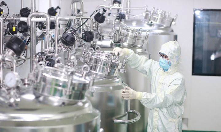 研發人員在麗珠生物的新冠疫苗試生產車間工作。(麗珠生物供圖)新華社發